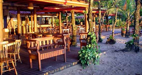 Restaurante praiano de menu variado tem bar lounge refinado com tablados descolados e mesas ao ar livre.